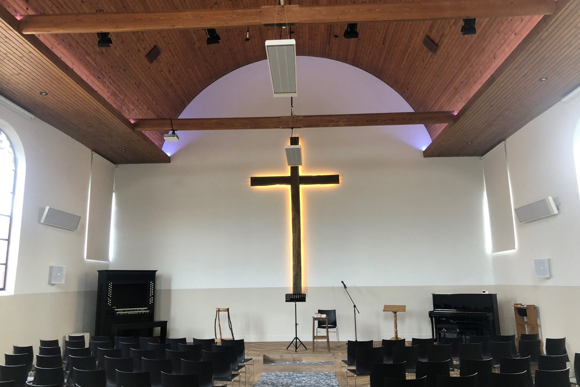 Binnen enkele minuten voelt de kerk direct behaaglijk aan. De infraroodstralers verwarmen personen en objecten, niet de lucht – ideaal bij wisselende bezetting, zoals kerkdiensten of concerten.